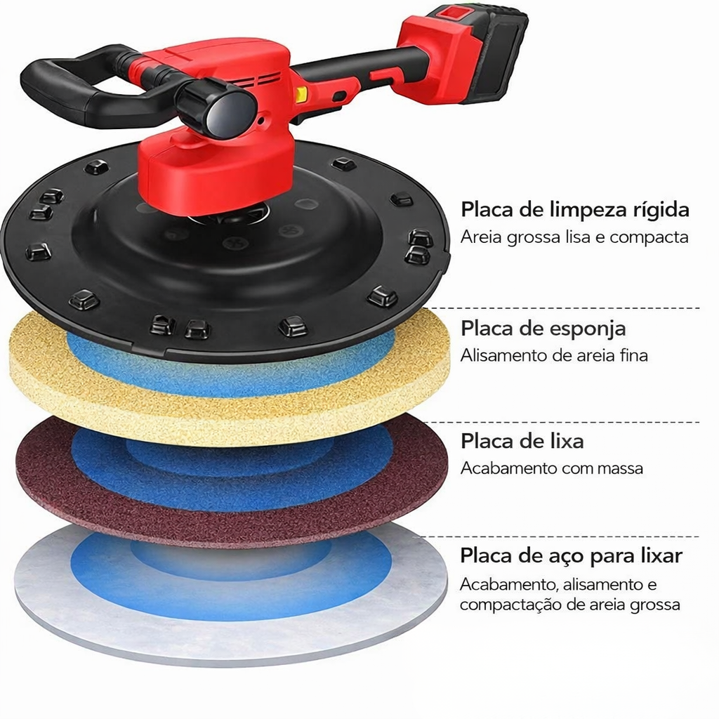 Inclui diferentes placas para nivelar, compactar, alisar e polir, garantindo acabamento perfeito em qualquer superfície.